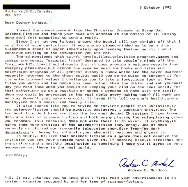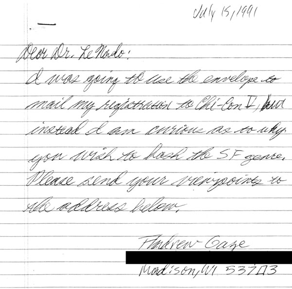 Andrew took an envelope intended for registration at Chi-Con and instead wrote the Christian Crusade in the summer of 1991. ![]()