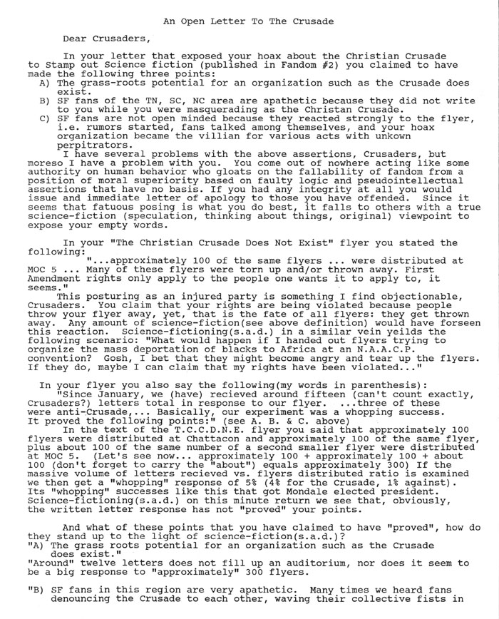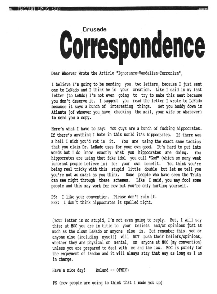 Magnum Opus Con, in the second issue of its “Fandom” newsletter, not only printed the “hoax” flyer in its entirety but devoted a page to its bold anti-Crusade stance, while promising more to come in its next issue. ![]() ![]()