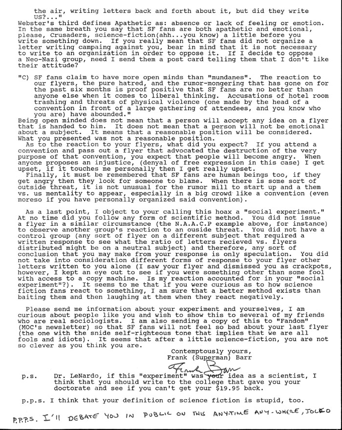 Inspired by the revelation that the Crusade was all a hoax, Frank “Superman” B. penned this dramatic “Open Letter To The Crusade” that was sent to the PO box and printed in MOC’s Fandom #3. He makes several insightful comments and points out numerous flaws in our methodology, and then blows it all by referring to himself as “Superman.” ![]()