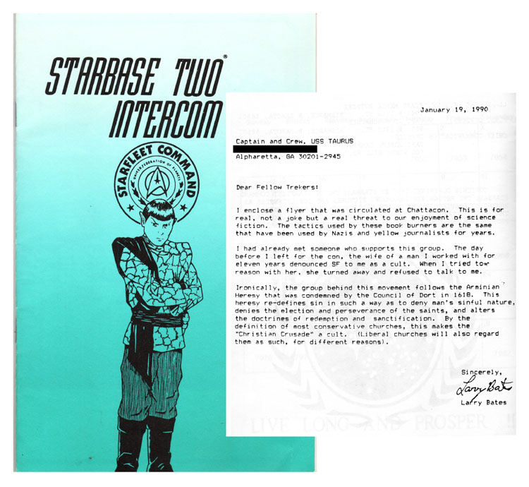 By the winter of 1990 Larry B. had realized the nature of the hoax, thanks to the fact that another of his letters, proclaiming that the Crusaders he had “met” were lobbying Congress to brand Saturday morning cartoons as pornography, got published alongside our "it's a hoax" flyer in the MOC "Fandom" 'zine, and he felt compelled to unburden himself upon his tormentors, namely us. Despite his worries, seventeen years hence, sci-fi has yet to be outlawed. ![]()