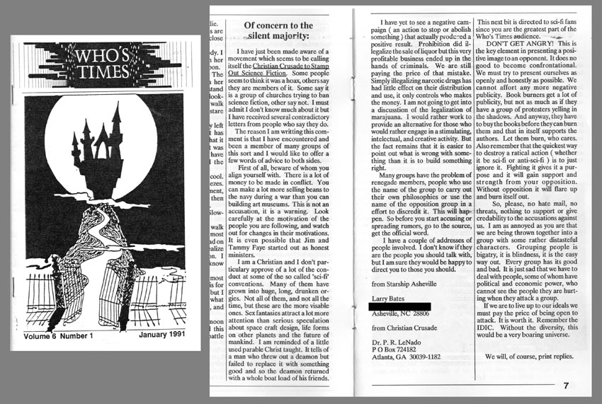 Larry B. continued to struggle against the Christian Crusade, this time in a letter to the Who’s Times newsletter published out of Athens GA in the fall of 1990 (cover date Jan 1991). He claims to have received letters from people who “know about the Crusade” (love to see those), then claims to have been a member of such groups himself, and finally engages in an aimless diatribe that touches on Christian parables and the legalization of marijuana. The editorial staff of Who’s Times asks people not to get mad. ![]()