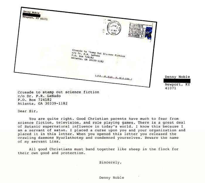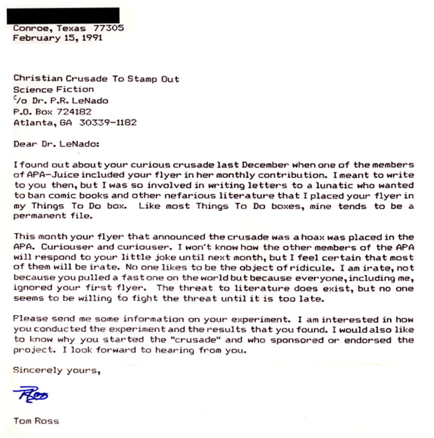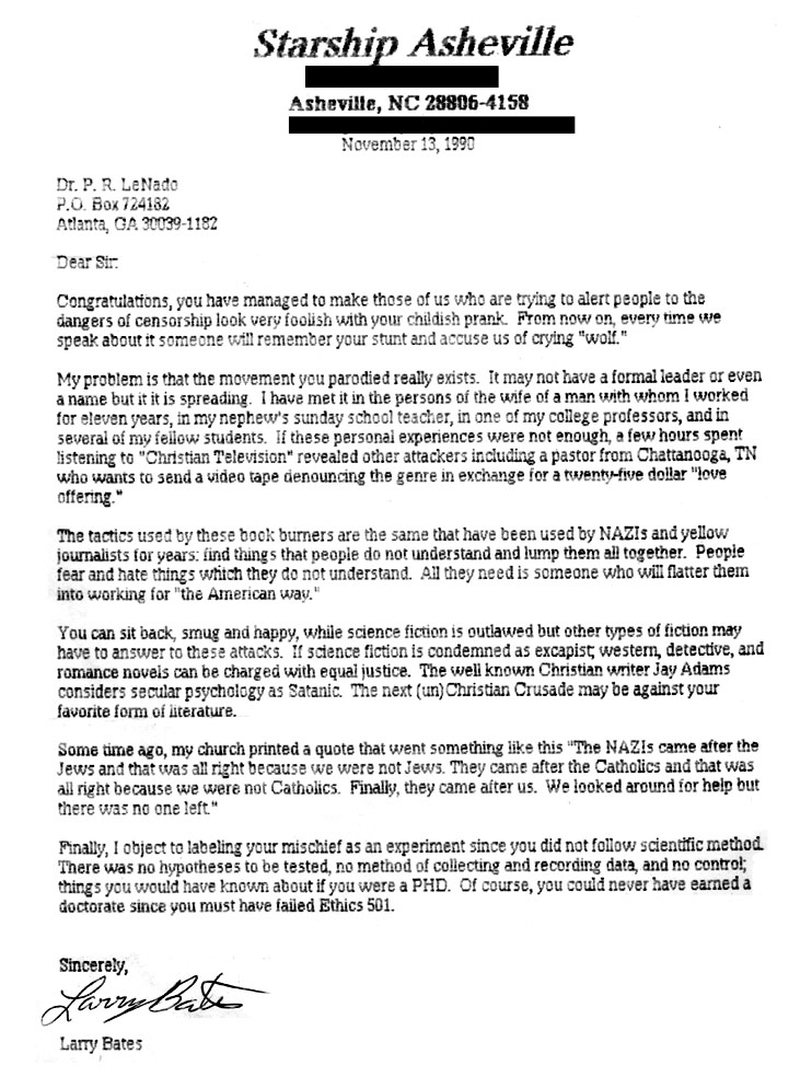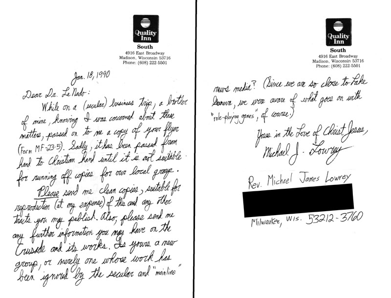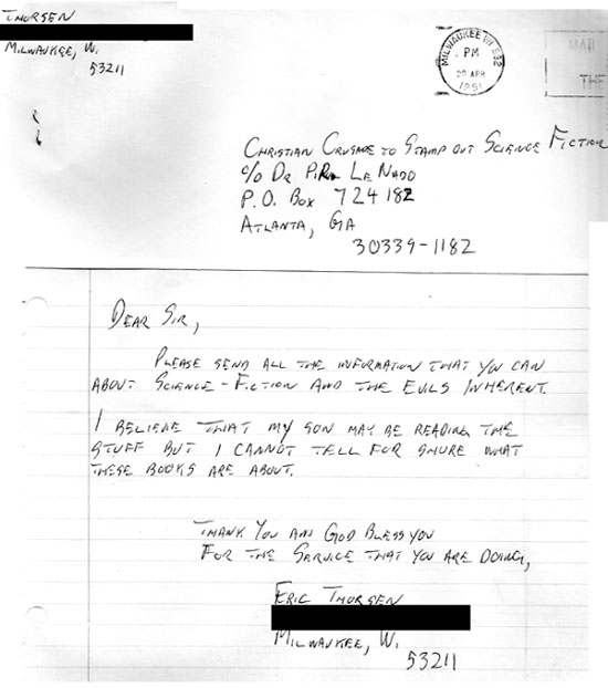 The first letter we received was from a reverend in Madison Wisconsin. On further reflection I get the feeling that this letter is a fake; it’s a little “over the top,” what with the “on a secular business trip” and the “from hand to Christian hand” business. Note the date; this was immediately following the Chattacon distribution. ![]()