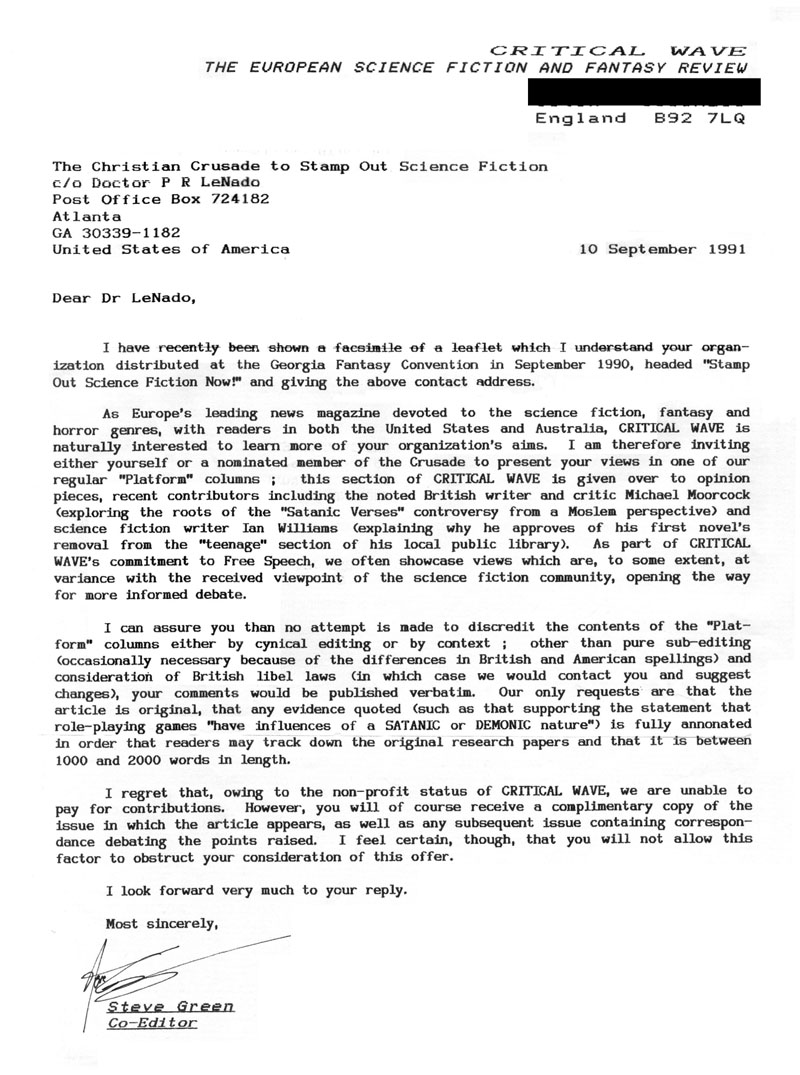 In the fall of 1991 we received this letter from Critical Wave, a British SF fanzine . This was the only letter that prompted a response; we wrote them back and told them in no uncertain terms that it was all a hoax and people should quit wasting time on it. Critical Wave did later feature an article on the Christian Crusade, hopefully spreading the truth, instead of spreading the hoax. ![]()