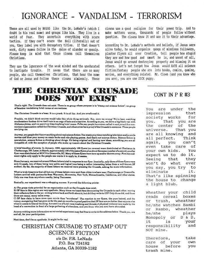 The second, half-sized Crusade flyer was distributed at Magnum Opus Con V in March. Completely dispensing with the relatively even tone of the original, this flyer veered wildly into obvious parody territory, which didn't stop the attendees (which included SF author Brad Strickland, who stopped in the middle of a panel discussion to inquire what the audience knew about the CC) from making wild speculations concerning the group and its criminal activities, often right in front of us. ![]() ![]()