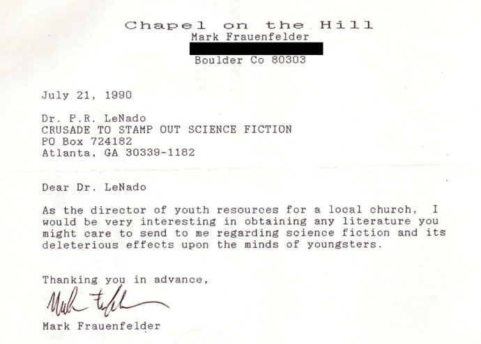 Mark F., purportedly the director of youth resources for his local church in Boulder Colorado (!!), wanted to know more about the deleterious effects of science fiction. Once again, real supporter or fake agent provocateur? ![]()