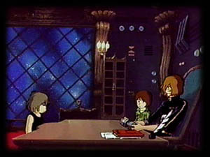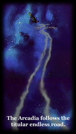 According to this timeline, the events depicted in My Youth in Arcadia are the beginning of the Harlock story as far as what has actually been animated is concerned. A few earlier points are mentioned, such as his first meeting with Emeraldas, and through her, Maeter (who is described as being the same person as Yukino Yayoi from Queen Millennia, another story point which would be revised in newer releases). Following Arcadia, we are told that Tochiro begins traveling in the Deathshadow with a mysterious individual, Harlock whoops ass on the Illumidas and then learns of the Mazone, the Deathshadow crashes on Heavy Meldar, Harlock rescues Mimay from Jura, and La Mimay leaves at the same time--all of these points being followed by a giggle-inducing parenthetical disclaimer of "details uncertain." After this, Doctor Zero, Yattaran, Maji, and Kei Yuki join the crew, and Harlock meets Tetsuro's father Faust (as seen in Adieu, Galaxy Express 999). Then come the events of the first 999 film, followed by the second, and finally the Space Pirate series as the wrap-up. Of course, this doesn't explain the two different origins of the Arcadia, or the two different deaths of Tochiro, except by basically ignoring the flashbacks in the original series. There are also two Zolls of Tokarga in this timeline, the total destruction and magical reappearance of planet Heavy Meldar, and the presence of Mayu, who seems to pop into the world despite the fact that her birth is never seen in the events of Arcadia or Galaxy Express 999, during which her father dies. Plus, we must hand it to the subterfuge of the Mazone. Not only has their huge occupying force gone unnoticed by humankind throughout the centuries, but it has apparently gone unnoticed by the Illumidas occupation force, as well. And we must conclude that Emeraldas, still seen fighting the good fight in Adieu, Galaxy Express 999, didn't consider the Mazone invasion to be worth getting involved in. This demonstrably doesn't work in the slightest, but it would seem that Endless Road SSX was supposed to clear up some of this. However, while it did clarify a few points, notably the defeat of the Illumidas and the Deathshadow's crash upon Heavy Meldar, it vainly tried to fix a few other problems and made some even worse: we are given a third death scene for Tochiro (similar to, but still incompatible with, the 999 version), a new backstory for Kei Yuki (along with a new father), and an Emeraldas who clearly never gives birth to anyone--she and Tochiro don't even get as far as a first kiss. The series as described in the Arcadia Roman Album would have featured Faust and Maeter, but Faust never appears, and Maeter is only ever seen on a computer readout in the first episode in silhouette, bearing the codename "Shadow X." As SSX only ran for half its originally projected length, it's possible that these story points would've eventually appeared had the series continued, but as it is, the show somewhat hastily wraps up at 22 episodes and never gets beyond a few slight references to Galaxy Express (i.e. the presence of the occasional machine person). Tochiro never travels in the Deathshadow with or without any "mysterious individual," the Mimay/La Mimay issue is never resolved, and Harlock takes aboard a completely different doctor, named Ban (the same name as Maeter's father. Could this be he? Is that even remotely logical?). As a sequel to Arcadia, SSX works just fine, though the recap of the film seen in episode one changes the dialogue so that Harlock, not Tochiro, names the ship "Arcadia." Perfect continuity is plainly not allowed. As a series unto itself, SSX is good enough, though it can't match the virtual perfection that was Space Pirate Captain Harlock. The truncated length hurts it, and the mood is much lighter than that of the older series, or the film, for that matter. Still, there are some great moments in SSX, including the duel with the Deathshadow in the excellent "Snowfall in the Sea of Stars," which not only reconciles the Deathshadow's fate with that seen in 999, but shows us the vulnerable side of Harlock as never before; the likes of his near-nervous breakdown in "Snowfall" have not been witnessed previously or since. The dramatic tension in the pivotal "Deliverance of Emeraldas" is some of the best in all the Harlock canon, as Harlock and Tochiro come to blows over the issue of rescuing the female pirate from a virtually inescapable trap, and Tochiro's swan song in episode 21 is not only heartbreaking, but also one of the best-directed episodes of any show ever. The real problem is the final episode's breakneck pace; there really should have been two episodes, if not three, to contain as many events as are squeezed into the one 25-minute finale episode. Still, it's a damn good series, and quite expensive-looking for its time, though the stock footage begins to be irksome after a time. Had it been allowed to run its full length, we might have been in for one of the best anime series ever--though I'd still put it in that category, just a few rungs lower. As an addendum, let me mention that this series is also sometimes known as Endless Orbit SSX or Eternal Orbit SSX. While these are legitimate translations of the original Japanese title "Mugen Kido SSX," the actual referent of the name is a pair of parallel-running gas trails that snake off into deep space (strongly resembling a road), which Harlock must follow during a crisis when the Arcadia is badly damaged and Tochiro lies in the infirmary. His half-conscious friend tells Harlock to "follow the endless road," and thus come to safety (and ultimately the mobile repair dock Mobile Fortress SSX). It's clear from this that "orbit" isn't the intended meaning, as Tochiro clearly isn't implying that they should fly in a big circle. And, in fact, they don't.