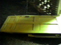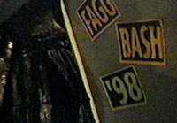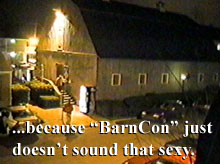 We showed up for MOCK the next Saturday night, dressed for the event in our "Crony" costumes, i.e. the same trenchcoats and hats we'd worn the previous week. Convention staff was checking for wristbands (normal, pin-on badges were, after all, a security risk because people could share them with saboteurs and other evil malcontents) at the front entrance, but we thought it might be possible to enter via the back door. As it happened, the back door was not merely unlocked, but was in fact lying on the ground by the rear entrance. We entered unmolested and circled the upstairs rooms, passing such venerable sci-fi events as the "Grab-ass Room" and the classic "Fagg (sic) Bash" before descending to the ground level and being immediately asked by con security to display wristbands we didn't have. Claiming we were looking for registration, I inquired about the cost of membership; our legitimate shock at being told that a convention at the end of its second day in a teetering stack of cinder blocks and timbers was still charging forty dollars for entrance served as a ready excuse to turn about and leave. We'd seen no sign of Rook, and a security escort wasn't going to provide us with many chances for blazing away with our Nerf armament. After a few minutes of trying unsuccessfully to start the car, get it in the proper gear, switch off the windshield wipers and actually drive away, we thanked our lucky stars we had not been running back after a successful pranking, security in pursuit and a speedy escape in mind, and went home. This shit wasn't working. We needed a new strategy. Perhaps the altogether simpler approach of the Christian Crusade had been the better idea all along.