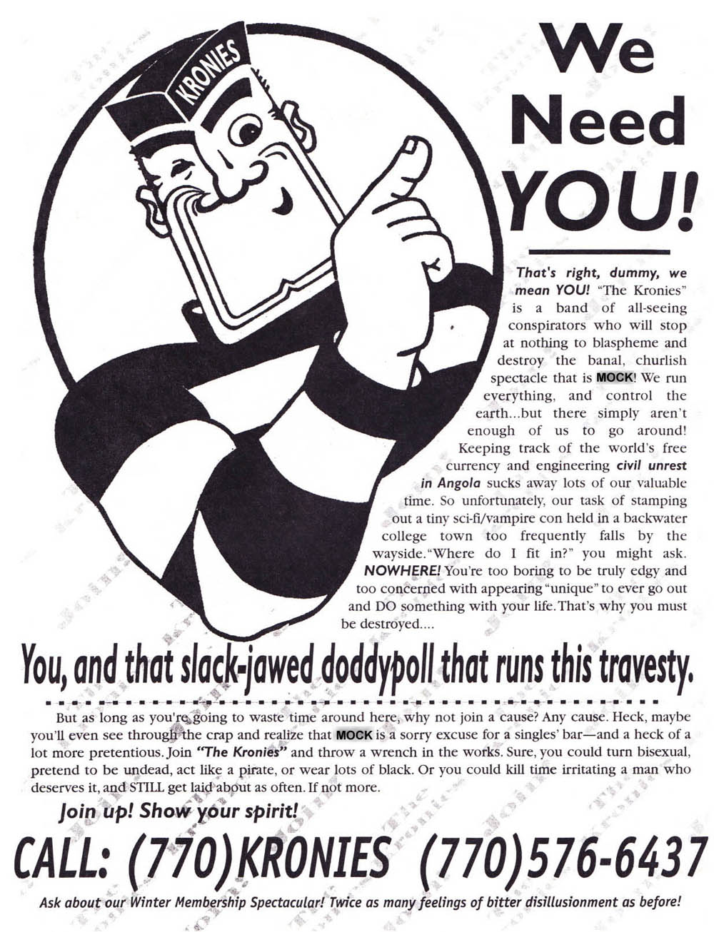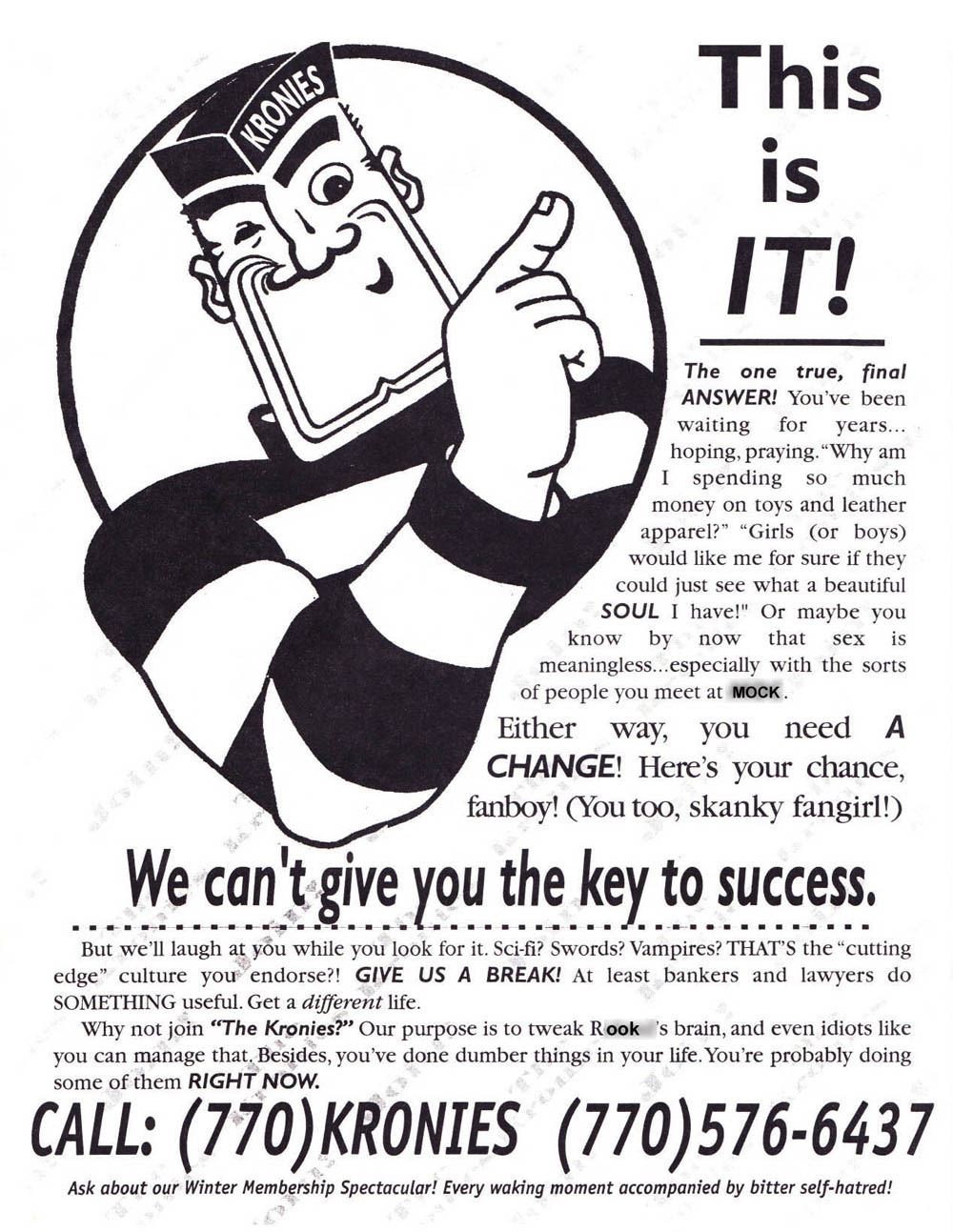So it was back to printed propaganda again. We produced two "Krony recruitment" flyers (click to enlarge) imploring readers to stop wasting time on SF and fantasy, and instead join The Kronies in asserting control over the one part of the world (MOCK) we had yet to conquer. Their purpose was obvious to anyone with two functional brain cells: we were blatantly spoofing Rook's own aggrandized assessment of his supposed enemies' power and influence. (Rook would later cite the text of these flyers as being a "confession," proving some people just don't get sarcasm, and/or are batshit crazy.) The crony rhetoric that was a staple on the MOCK message board made it clear just whose cronies Rook believed were behind the alleged war on his event: he blamed the whole thing on Ed Kramer, head of Atlanta's behemoth convention Dragon Con, for his failing business, though he was careful not to name Ed directly due to a previous slander lawsuit. With this in mind, we used the spelling "Krony" to suggest the name "Kramer," even though we had no association with the man. I personally couldn't have picked Ed Kramer out of a lineup, which is unfortunate, since that's exactly the sort of place one was likely to find him in later years, for widely-reported reasons.