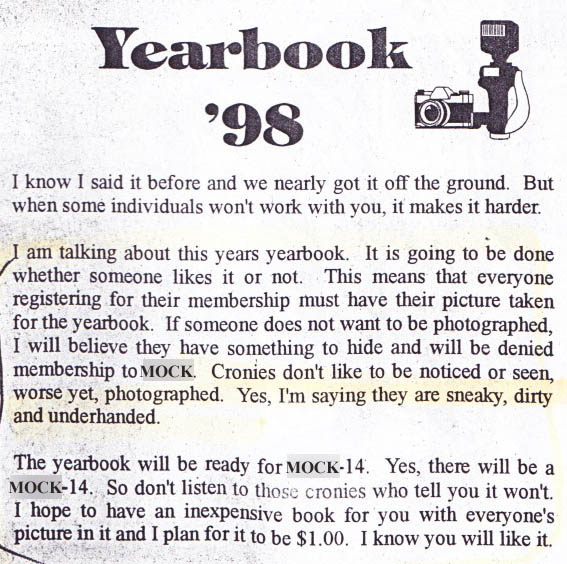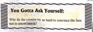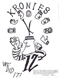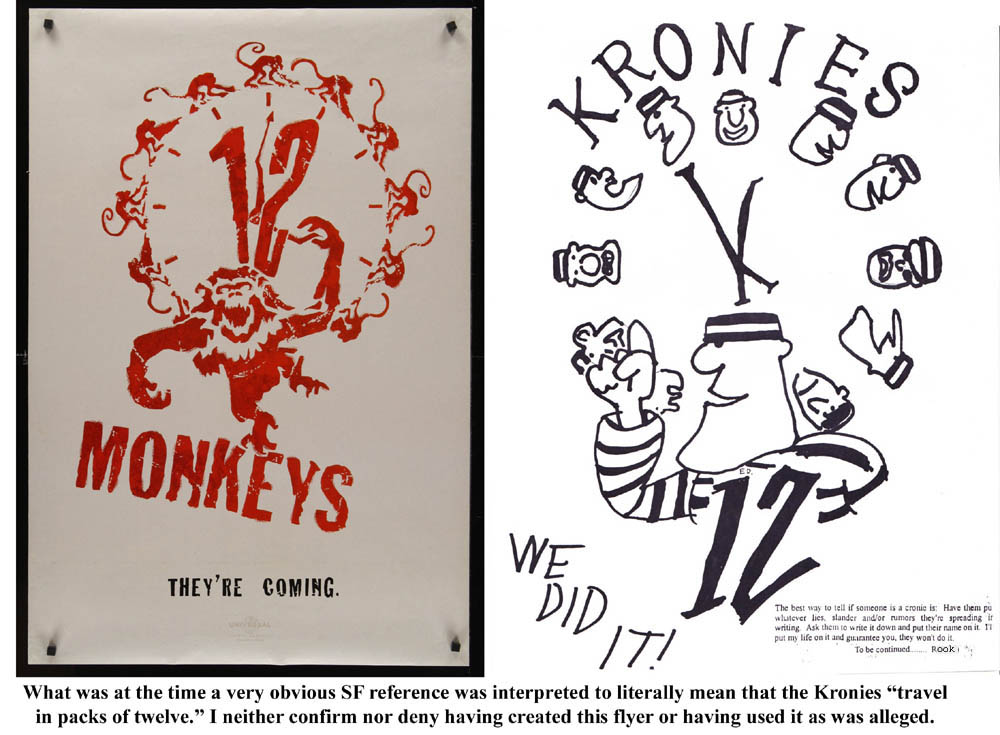 Being illegally detained by cop-impersonators was not the greatest of experiences, though after being shoved about by what might have been actual cops who seemed actually inebriated, Mr. Rook managed to lighten the mood upon his entrance by turning the proceedings comically surreal, accentuated by his personal Greek chorus of supporters, who spouted comments along the lines of, "You tell 'em, Big Dog!" and "I'll see you at Dragon Con!" (He didn't, because I don't go to Dragon Con.) It would later be claimed at our hearing that a different set of Krony flyers, based on a piece of clip art in MOCK's own newsletter and styled after the poster for the then-recent sci-fi film 12 Monkeys, had been pasted up at Rook's comic shop, which gave some context to his advisory, which he gave to his staff during our detainment, that "We know they travel in packs of twelve." He identified us at once as "those guys from the Radisson," his staffers speculated that we must be brothers because we had the same first name, and Rook kept pacing past with offers that we come clean, or else we'd "hang for everything your gang has ever done! Talk now, or hang forever!" K1 replied that we'd merely found those flyers lying in the back hall before they separated us for questioning, an act which was almost certainly illegal. More illegal, I mean, than what we'd been doing. Significantly so.