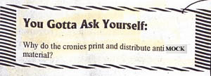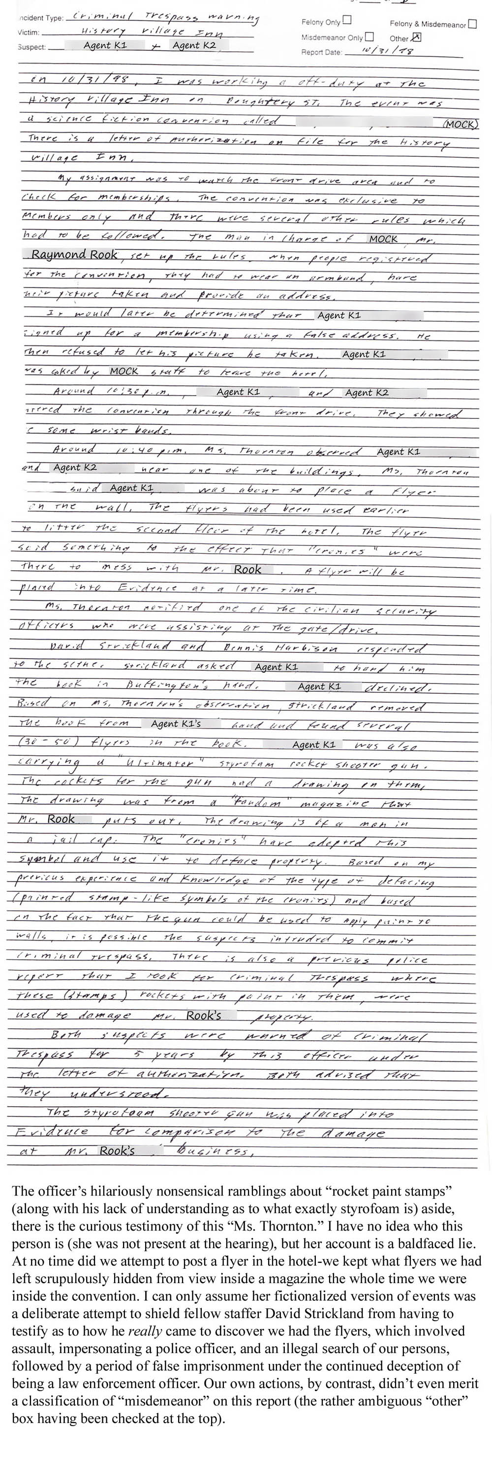 The heart attack, despite its value to the drama of the story, had, in the final analysis, been something of a bad thing. Not because he blamed us for it, which was absurd (who was trying to prosecute whom here, anyway?), but because it allowed Rook a do-over of a hearing which had been going 100% our way, giving him a few months in which to chew over just what he'd done wrong the first time, which had been most everything. He didn't bring a lawyer, but he did bring a VCR, and as if the contents of the tape weren't bad enough, he alleged that we were also responsible for pasting the 12 Monkeys-style flyers on his store due to the fact that the giant dart affixed to the giant dart gun we'd brought sported a crony head, copied from the same clip art of Rook's that had inspired the "12 cronies" flyer, drawn conspicuously on the front. Nevertheless, there was something entertainingly surreal and wholly laughable about hearing highly-educated legal professionals discussing "the Kronies" in deadpan-serious tones. After this, things started to level off in terms of efficacy. Rook brought as a witness the lunatic cop who had escorted us from the motel, who took the stand to propose that the big foam dart with the crony head hand-drawn on it with a Sharpie was actually some kind of stamp which had been filled with ink and shot against the comic book store, somehow producing the far more complex picture on the "12 cronies" flyers that were glued there (as stated in the report on right). No, those flyers could not possibly have been made with anything so prosaic as a copy machine, such as the ones at the Kinko's that was about one block from Rook's store; in the eyes of Sgt. Yokel McShortbus, they were obviously the product of blank sheets of paper stuck to a storefront which were then shot with an ink-filled foam dart hand-decorated with a far simpler image, through which the ink somehow magically knew to flow. Our lawyer countered with, "Your Honor, I submit that that is ludicrous," to which the cop replied that "he'd seen it happen." I'm sure you have, Mr. Officer.