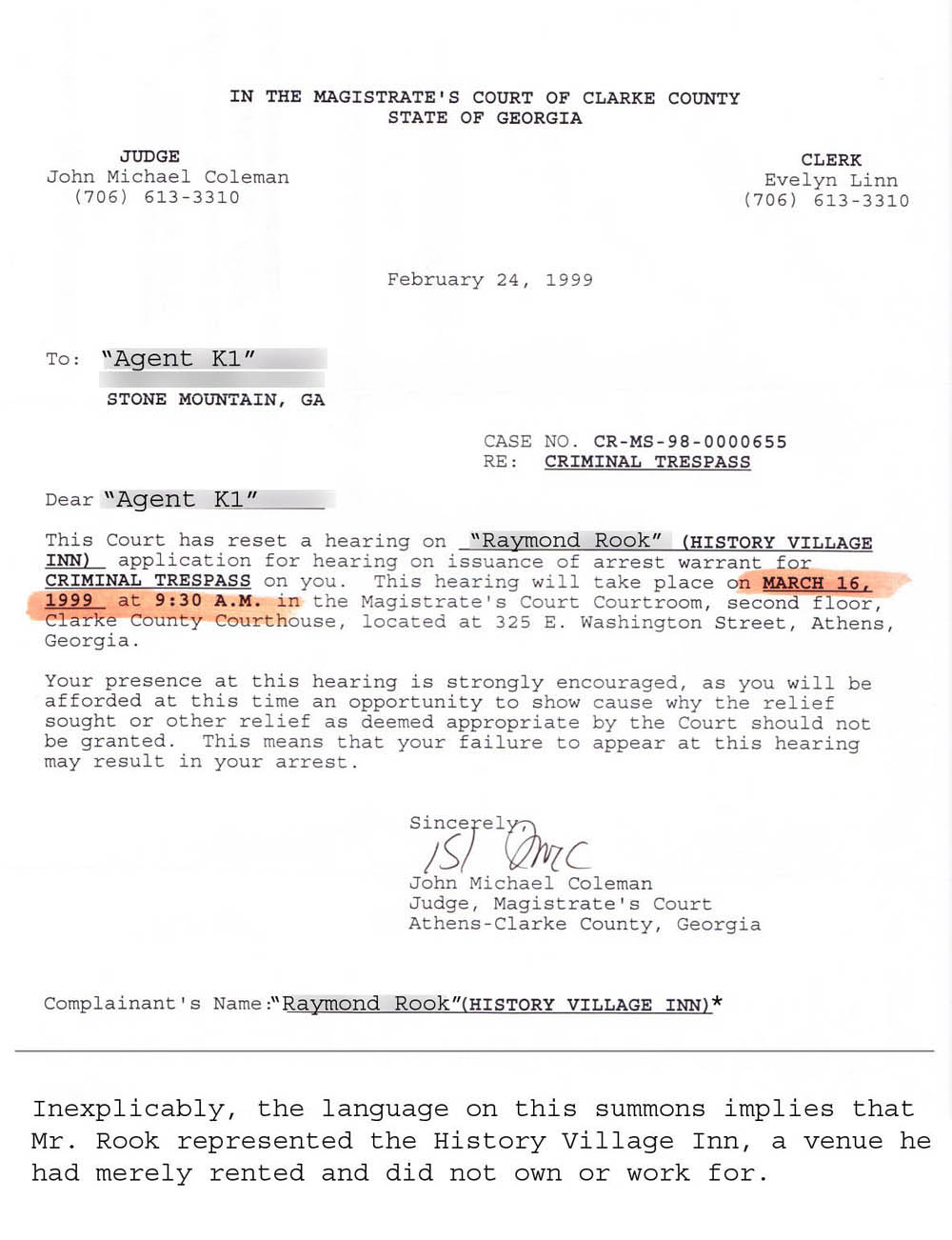 February of 1999 rolled around, and the utterly unexpected happened: we both received summons to return to court. It seemed Mr. Rook had not yet had enough of the whole deal. We drove the ninety-minute route back to Athens a second time to be told upon our arrival that the hearing had been rescheduled due to the fact that our lawyer's father had had a stroke and no one had thought to tell us. Finally, on March 16th, we went back for the third and final time. The third time's a charm, they say.