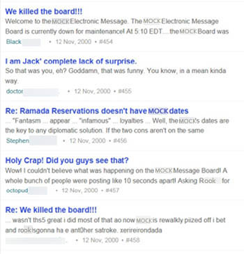 There was, of course, no edict that we couldn't talk about Rook, just not to him. So the following year we started up an "E-group" (which later became Yahoo Groups, which later became totally obsolete) called "MOCKFANDOM," and then proceeded to start a flame war between several sock puppet accounts on the subject of whether "MOCK sux!" or "MOCK rulezz!" for a few weeks before actual MOCK members caught on to the group's existence and began to join in.